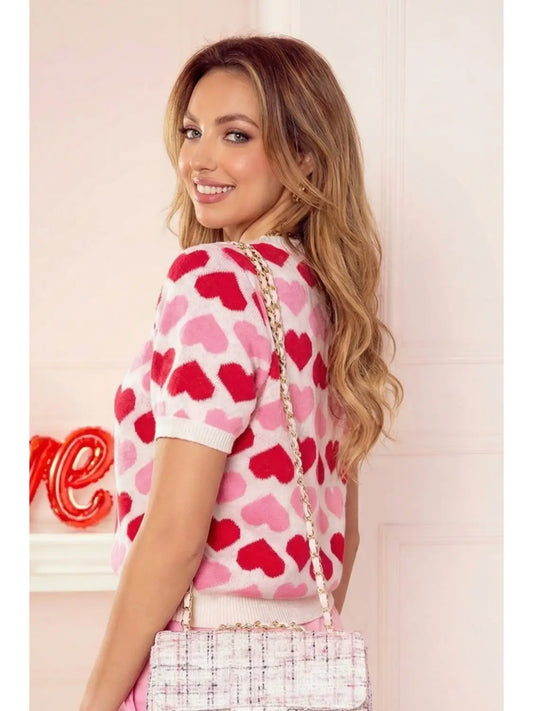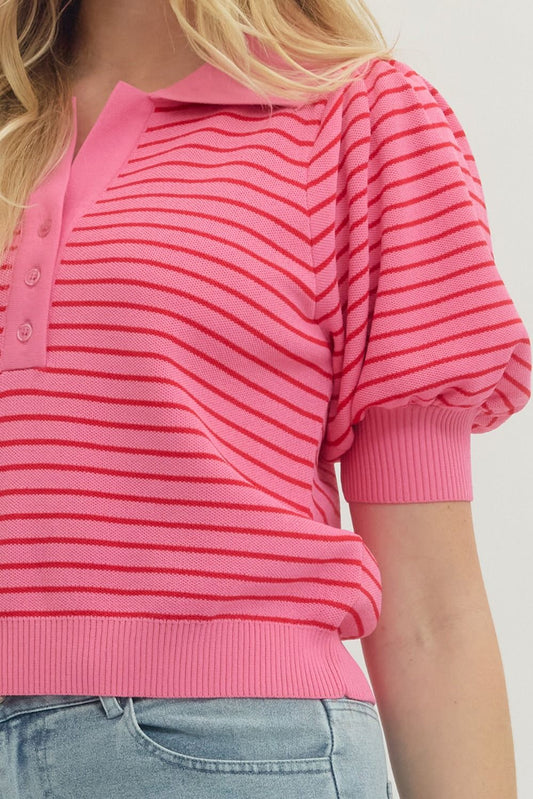 Striped Cropped Red & Pink Puff Sleeve Polo Neck Top