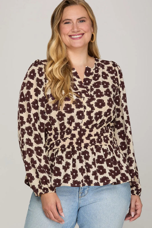 Long Sleeve Floral Woven Print Top Elastic Waist Cream/Plum