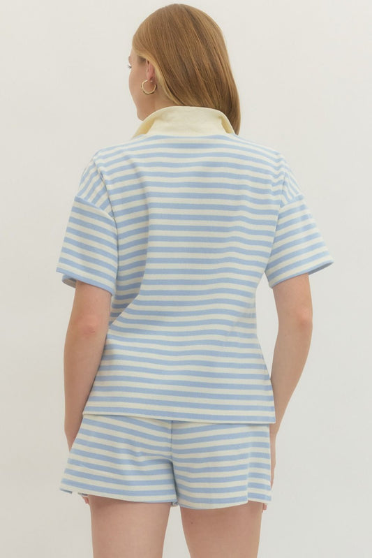 Striped Light Blue Collared V Neck Top