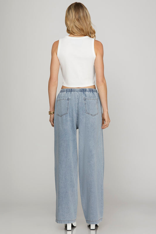 Washed Denim Pants - Elastic Waist & Side Pockets